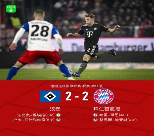 北京时间2月1日德国足球顶级联赛 联赛 第20轮,汉堡主场对阵拜仁慕尼黑。汉堡法比奥-维埃拉破门,卢卡-武什科维奇破门。拜仁慕尼黑哈里-凯恩破门,路易斯-迪亚斯破门。最终比分汉堡 2-2 拜仁。